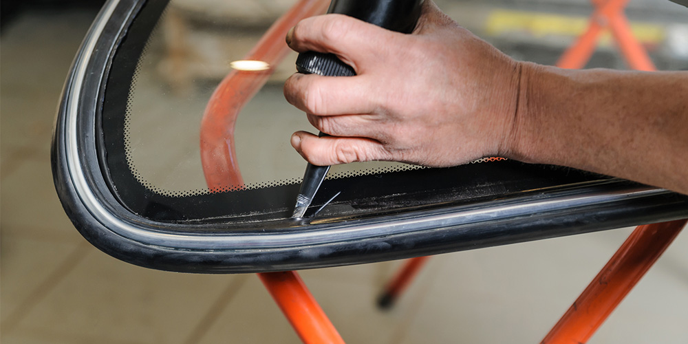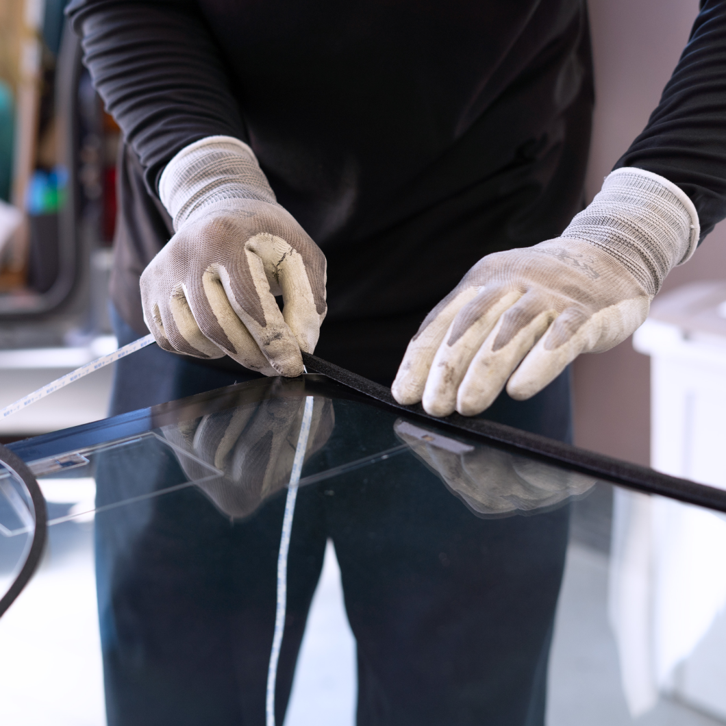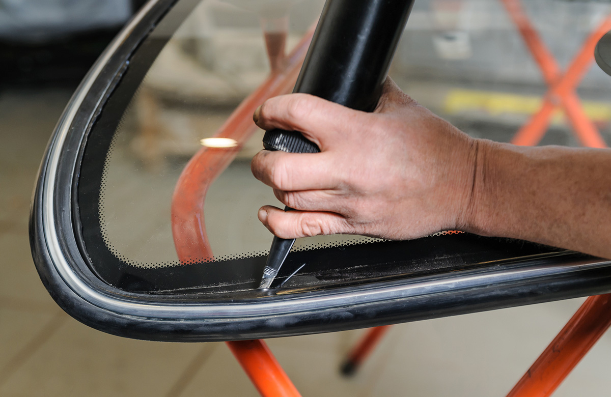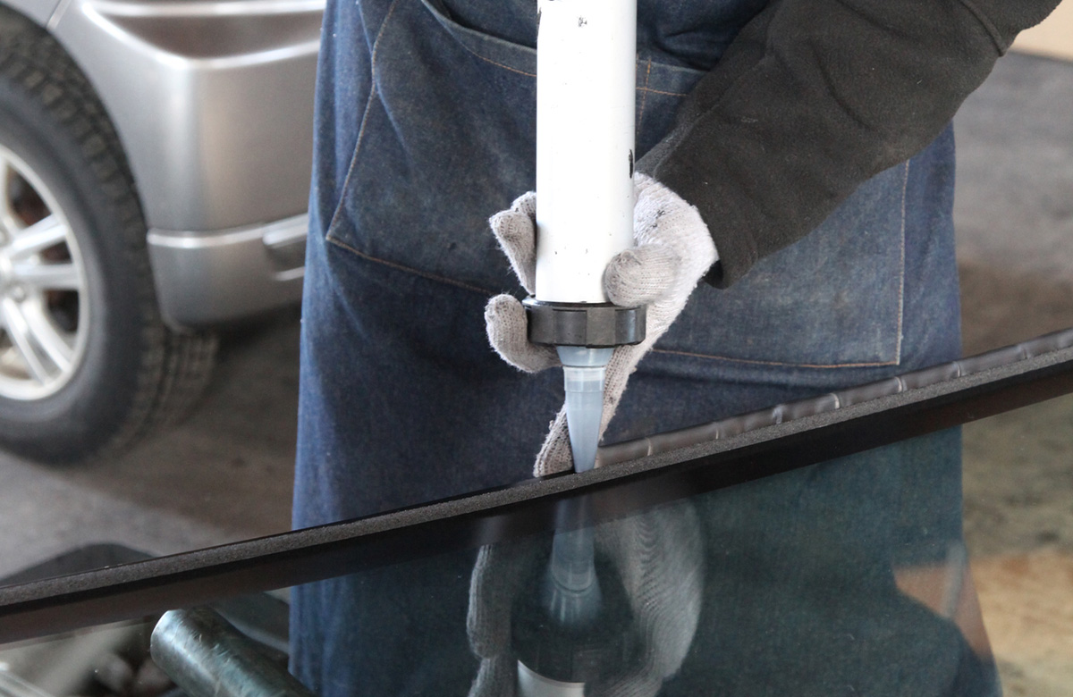 新しく取りつけるガラスに専用の接着剤を塗布します。